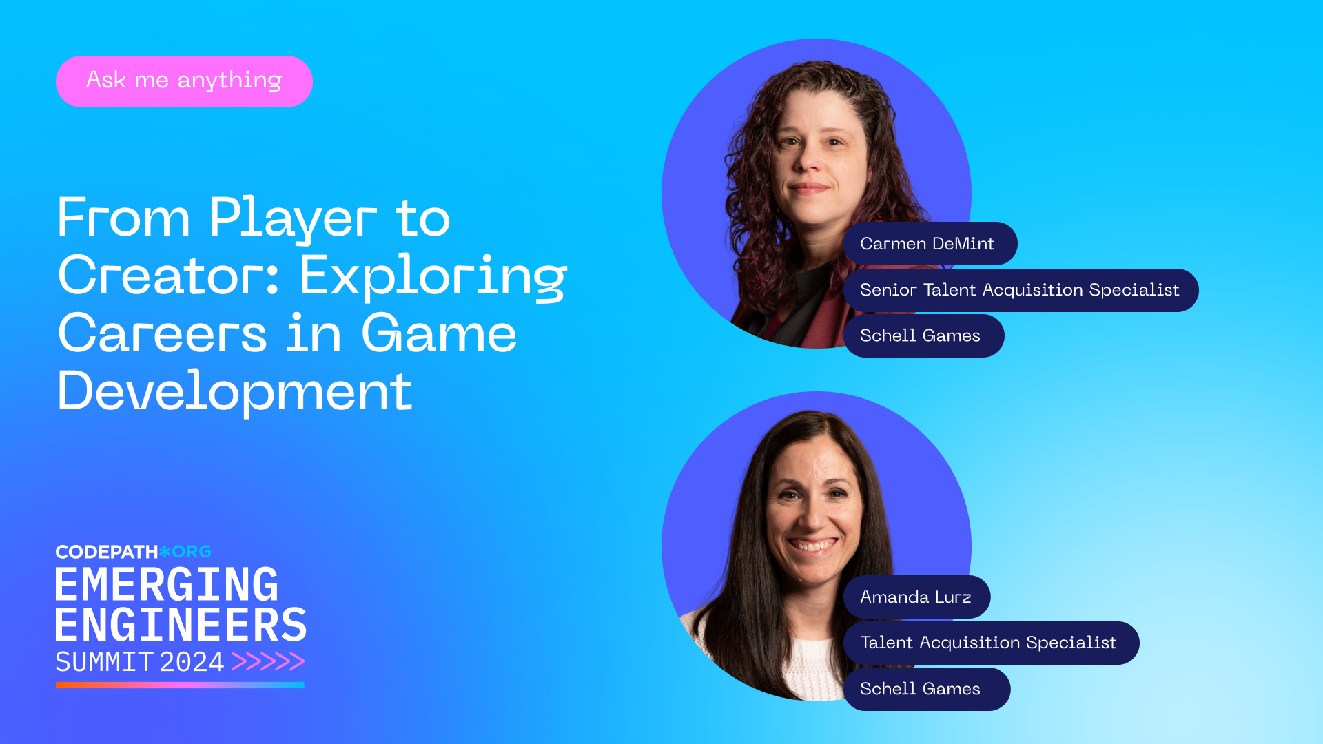 [{"content":{"text":"Sign up for CodePath.org's Emerging Engineers Summit 2024<\/a>, the nation\u2019s largest and most diverse event dedicated to Gen Z tech talent for 3 days of learning, conversations, and talent matching with industry leaders.<\/p>Schell Games' Carmen DeMint, Senior Talent Acquisition, and Amanda Lurz, Talent Acquisition, will be participating in an Ask Me Anything session entitled From Player to Creator: Exploring Careers in Game Development<\/em> on Wednesday, Oct. 2, 2024.Sign up online for this FREE and VIRTUAL experience: https:\/\/www.codepath.org\/employers\/emerging-engineers-summit<\/a><\/p>"},"id":"92292cf6-3abf-49c8-a696-8edf15edcb57","isHidden":false,"type":"textBlock"},{"content":{"location":"kirby","image":["file:\/\/wvTQXWs6ESO2A6JY"],"src":"","alt":"","caption":"","link":"https:\/\/www.codepath.org\/employers\/emerging-engineers-summit","ratio":"","crop":"false"},"id":"dcb5ddac-ab98-457e-9850-3e032d41bf6e","isHidden":false,"type":"imageBlock"}]