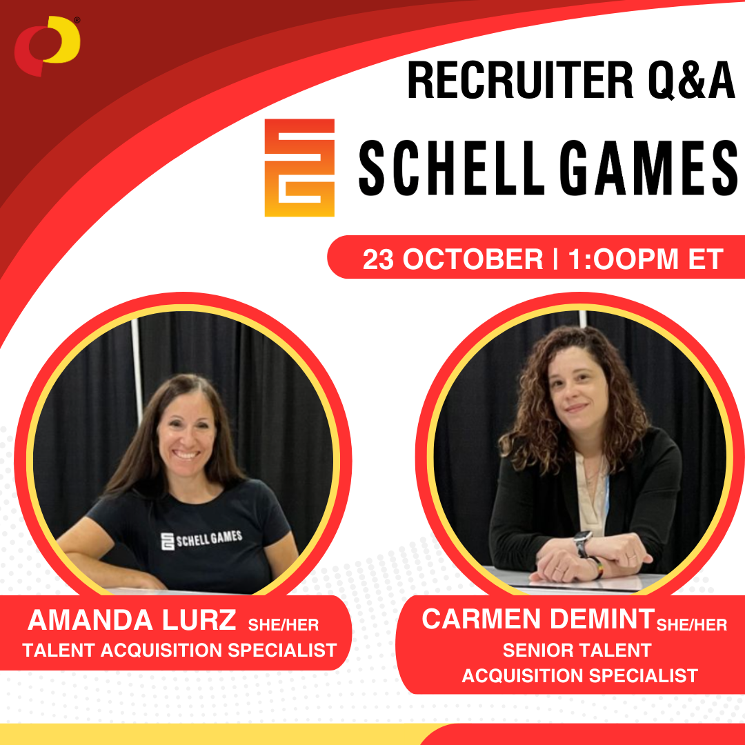 [{"content":{"text":"Join IGDA<\/a> for a Schell Games Studio Overview with Recruiter Q&A!<\/p>Meet with Schell Games' Carmen DeMint, Senior Talent Acquisition, and Amanda Lurz, Talent Acquisition, Wednesday, Oct. 23, 2024 as they answer your questions about what they're looking for when hiring at Schell Games.Carmen DeMint is a dedicated, dynamic recruiter specializing in diversity and inclusion within the entertainment and media industry; they bring over 20 years of experience to the table. As a certified diversity recruiter, they are passionate about matching exceptional talent with their dream roles while championing authenticity.As a professional with over 20 years of recruiting experience, Amanda truly enjoys working with passionate individuals of all levels to help them find their own professional path. Amanda started out her career in undergraduate admission at Carnegie Mellon University, where she learned to help young adults walk through their college choices with knowledge of the process as well as bringing care and a personal touch. Amanda completed her academic recruitment experience and made a move to graduate admission, where she was able to take her recruitment knowledge to a new level, which included application strategies, marketing, financial aid, and event planning. Amanda's recent change to Schell Games has allowed her to step into a brand new industry as a recruiter, and she loves being able to help make other people\u2019s dreams come true as a game developer!<\/p>Register for this event: https:\/\/streamyard.com\/watch\/7h3NMa8hs3SQ<\/a><\/p>"},"id":"382d3695-e6ad-46a2-9763-e93c4dff008e","isHidden":false,"type":"textBlock"},{"content":{"location":"kirby","image":["file:\/\/8RvoejN9pRenkmyq"],"src":"","alt":"","caption":"","link":"https:\/\/streamyard.com\/watch\/7h3NMa8hs3SQ","ratio":"","crop":"false"},"id":"33d705d2-d991-4506-98eb-5e8a84bb6c88","isHidden":false,"type":"imageBlock"}]