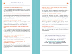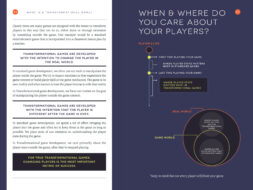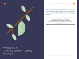 [{"content":{"text":"Hi, this is Sabrina. I\u2019m a designer here at Schell Games and I\u2019ve been with the studio for a while \u2013 long enough to be part of our transition from a purely entertainment studio to one that is doing about two-thirds what we call transformational<\/em> games<\/em><\/strong>, or games that are designed to change the player in some way.<\/p>Having been a design lead or project director on several of these projects, I\u2019ve seen that they have some production and design needs that differ from traditional pure entertainment games. So, one of the projects I\u2019m working on here at Schell Games is the creation of a \u201cfield guide\u201d for design leaders on transformational game projects \u2013 a resource that is useful both as a guide for those new to the process, and as a reference for those that are more experienced. One big piece of this guide is an overview of the \u201cTransformation Framework,\u201d a process and documentation tool for transformational games that I\u2019ve been helping to develop here at the studio.<\/p>It started out as an internal project, but now there is a tentative thought that this guide could be useful to other developers outside Schell Games, so I\u2019m planning on sharing some pages in progress on the SG Labs blog over the next few months. Keep in mind that everything here is essentially in early draft format!<\/p>If what you see piques your interest, leave a comment or get in touch: sabrina@schellgames.com.<\/p>To kick things off, here are a few pages from the early sections of the book:<\/p>What defines \u201ctransformational games\u201d for the purposes of this field guide<\/strong><\/p>"},"id":"ec0dbe5f-8c52-4038-a2c2-799fa634087e","isHidden":false,"type":"textBlock"},{"content":{"location":"kirby","image":["file:\/\/F0qkCCaZLhqdnLTE"],"src":"","alt":"","caption":"","link":"","ratio":"","crop":"false"},"id":"498013ab-fba7-4000-a290-e176501c0e3a","isHidden":false,"type":"imageBlock"},{"content":{"location":"kirby","image":["file:\/\/4CqpF7kdMWvQjBtL"],"src":"","alt":"","caption":"","link":"","ratio":"","crop":"false"},"id":"4b8f6b21-482b-442c-a930-04a1e9d5c7cb","isHidden":false,"type":"imageBlock"},{"content":{"text":"Some of the reasons that we believe establishing a better process for transformational games is so important.<\/strong><\/p>"},"id":"b3cb60b7-0a9a-4616-a297-c2d9726858a7","isHidden":false,"type":"textBlock"},{"content":{"location":"kirby","image":["file:\/\/fjJRpi1eNFn5jgNx"],"src":"","alt":"","caption":"","link":"","ratio":"","crop":"false"},"id":"1221ac4e-859c-44ff-92c7-87f57d28129b","isHidden":false,"type":"imageBlock"}]