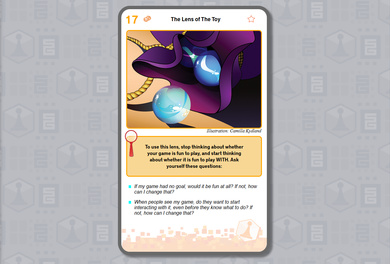 If my game had no goal, would it be fun at all? If not, how can I change that?When people see my game, do they want to start interacting with it, even before they know what to do? If not, how can I change that?Read MoreDeck of Lenses
